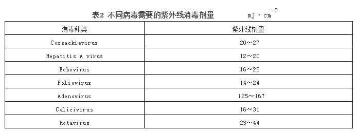 紫外線主要破壞病毒的核酸,也會對病毒的蛋白質外殼產生一定破壞。徐麗梅研究了紫外線對Polioviru病毒的殺滅作用,低劑量的紫外光線能透過病毒蛋白質外殼導致病毒RNA的損傷[33]。波長為254 nm的紫外線照射5 min時,病毒數量明顯減少,254 nm紫外線照射30 min時,感染細胞內檢測不到病毒粒子。波長為254 nm的紫外線比365 nm的紫外線照射滅活腺病毒氣溶膠的效果更顯著,254 nm紫外線和65 ℃熱力對一些病毒有不同程度的滅活作用,紫外線照射可作為室內空間整體消毒的一種方法。不同病毒需要的紫外線消毒劑量見表2。